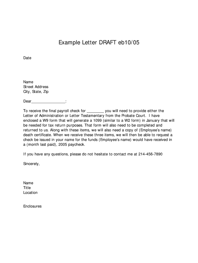 Example Letter DRAFT eb10/05 Date Name Street Address City, State, Zip Dear : To receive the final payroll check for you will need to provide either the Letter of Administration or Letter Testamentary