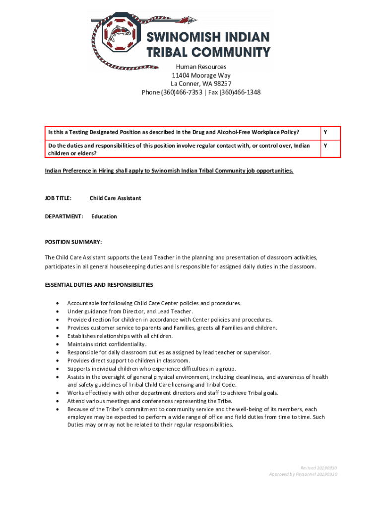 Human Resources 11404 Moo rage Way La Conner, WA 98257 Phone (360)4667353 Fax (360)4661348Is this a Testing Designated Position as described in the Drug and Alcoholize Workplace Policy? Do the duties