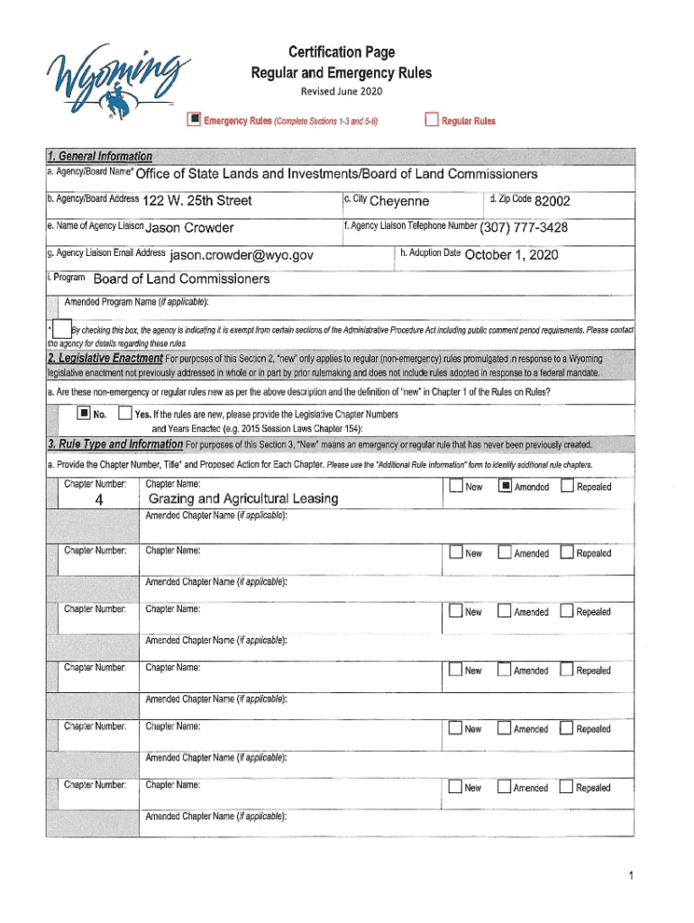 Certification Page Regular and Emergency Rules Revised June 2020D Regular Rules ! Emergency Rules (Complete Sections 13 and 56) 1. General Information a. Agency/Board Name* Office of State Lands and