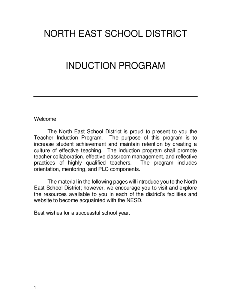 NORTH EAST SCHOOL DISTRICTINDUCTION PROGRAMWelcome The North East School District is proud to present to you the Teacher Induction Program. The purpose of this program is to increase student achievement