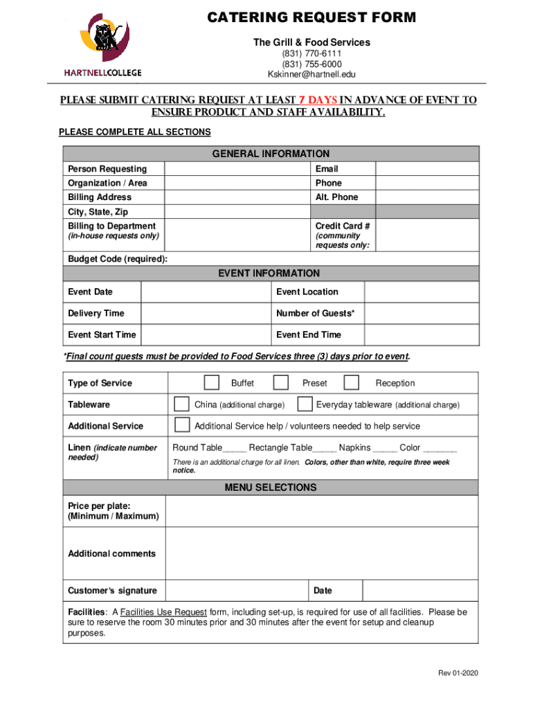 CATERING REQUEST FORM The Grill & Food Services (831) 7706111 (831) 7556000 Skinner Hartnell. Please submit catering request at least 7 days in advance of event to ensure product and staff availability.