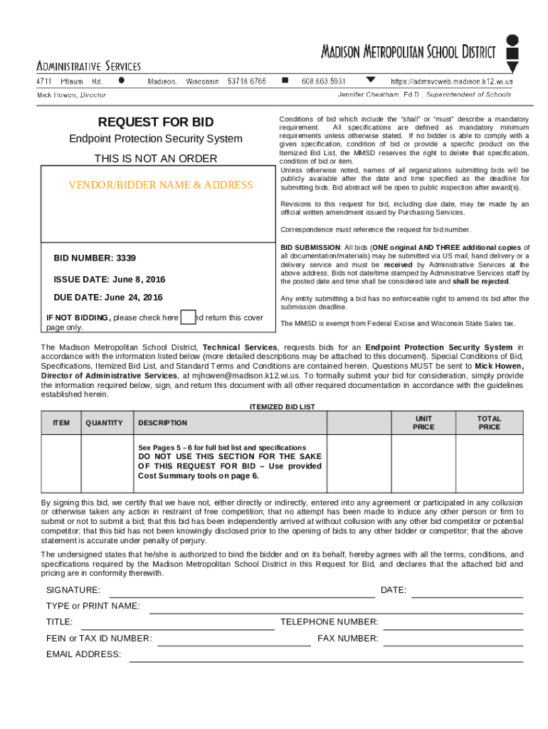 The ACKNOWLEDGEMENT OF RECEIPT OF BID PACKAGE REQUEST FOR BID ... is a Word document that has to be filled-out and signed for specific purpose. Next, it is furnished to the exact addressee in order to provide specific details of any kinds. The completion and signing may be done in hard copy or with a trusted service e. g. PDFfiller. These services help to complete any PDF or Word file without printing out. It also lets you edit its appearance according to your requirements and put legit e-signature. Once finished, you send the ACKNOWLEDGEMENT OF RECEIPT OF BID PACKAGE REQUEST FOR BID ... to the respective recipient or several of them by email and also fax. PDFfiller is known for a feature and options that make your Word template printable. It provides a number of settings for printing out. It doesn't matter how you file a form after filling it out - in hard copy or electronically - it will always look professional and organized. To not to create a new writable document from the beginning again and again, turn the original file as a template. Later, you will have a rewritable sample.