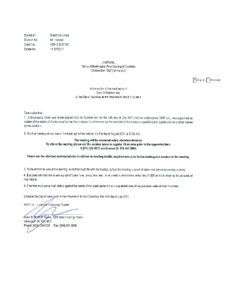 District of BRITISH COLUMBIA Division No. 04 Vernon Court No. 112753214 Estate No. 112753214 In the Matter of the Bankruptcy of: Solo GI Nutrition Inc. Debtor MNP LTD / MNP LTE Licensed Insolvency