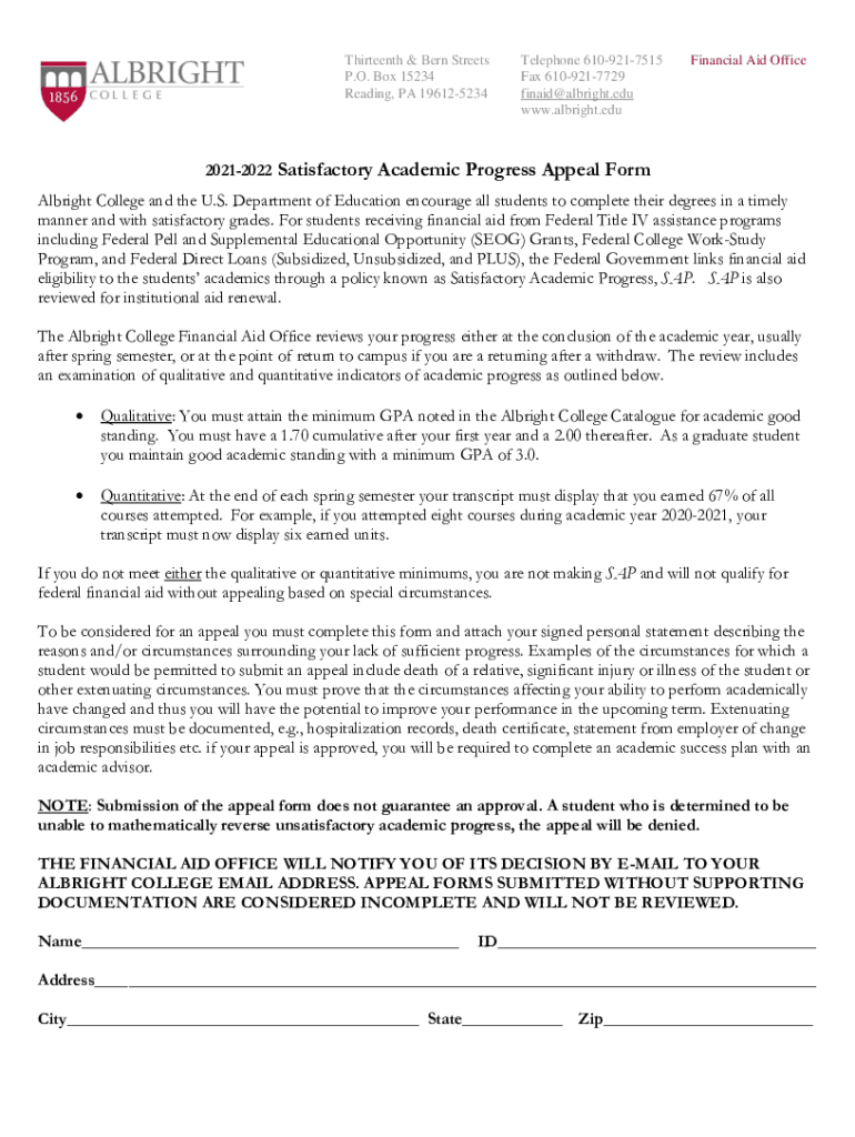 Thirteenth & Bern Streets P.O. Box 15234 Reading, PA 196125234Telephone 6109217515 Fax 6109217729 fin aid Albright.edu www.albright.eduFinancial Aid Office20212022 Satisfactory Academic Progress Appeal