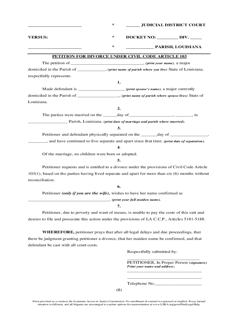Get the free SELF-REPRESENTED LITIGANT PETITION FOR DIVORCE (103) (NO ...