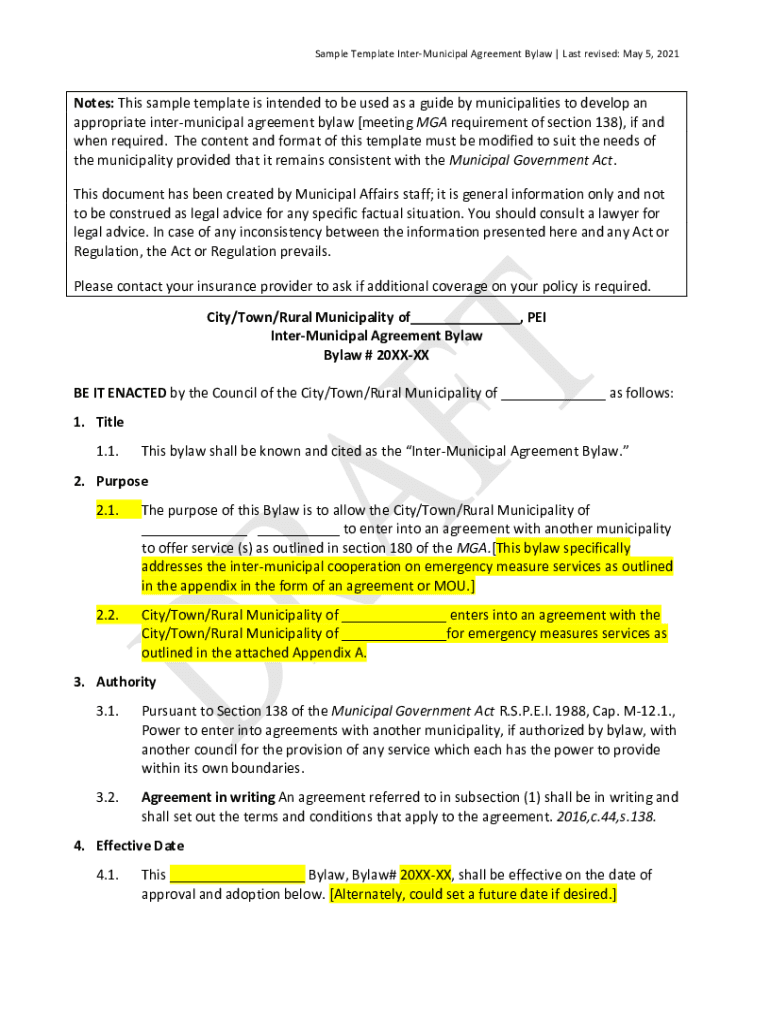 Sample Template InterMunicipal Agreement Bylaw Last revised: May 5, 2021Notes: This sample template is intended to be used as a guide by municipalities to develop an appropriate intermunicipal agreement