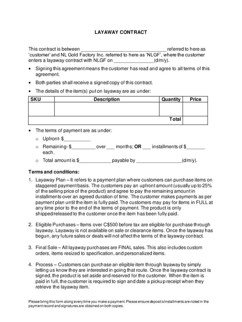 LAYAWAY Contracts contract is between referred to here as customer and NL Gold Factory Inc. referred to here as LGF, where the customer enters a layaway contract with LGF on (d/m/y). Signing this