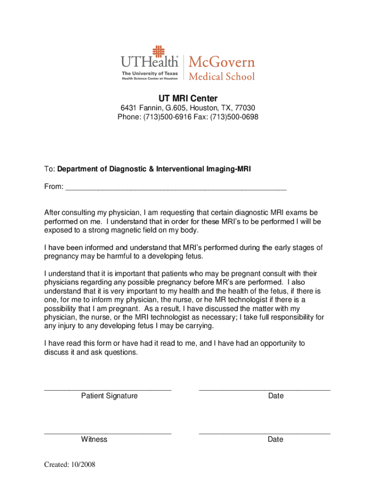 UT MRI Center 6431 Fannie, G.605, Houston, TX, 77030 Phones: (713)5006916 Fax: (713)5000698To: Department of Diagnostic & Interventional Imaging MRI From: After consulting my physician, I am requesting