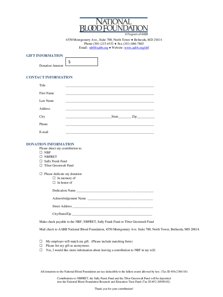4550 Montgomery Ave., Suite 700, North Tower Bethesda, MD 20814 Phone (301) 2156552 Fax (301) 6867865 Email: NBF AAB.org Website: www.aabb.org/nbfGIFT INFORMATION Donation AmountCONTACT INFORMATION