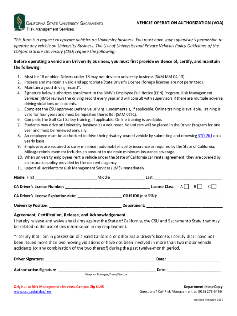 CALIFORNIA STATE UNIVERSITY SACRAMENTOVEHICLE OPERATION AUTHORIZATION (VOA)Risk Management ServicesThis form is a request to operate vehicles on University business. You must have your supervisors