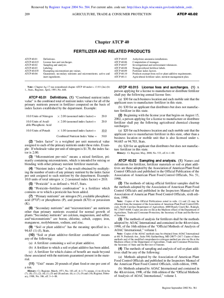 Removed by Register August 2004 No. 584. For current Adm. Code see: http://docs.legis.wisconsin.gov/code/admin code. 209ATCP 40.02AGRICULTURE, TRADE & CONSUMER PROTECTIONChapter ATOP 40 FERTILIZER