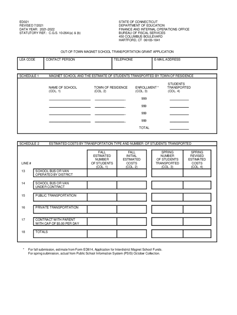 ED021 REVISED 7/2021 DATA YEAR: 20212022 STATUTORY REF.: C.G.S. 10264i(a) & (b)STATE OF CONNECTICUT DEPARTMENT OF EDUCATION FINANCE AND INTERNAL OPERATIONS OFFICE BUREAU OF FISCAL SERVICES 450 COLUMBUS
