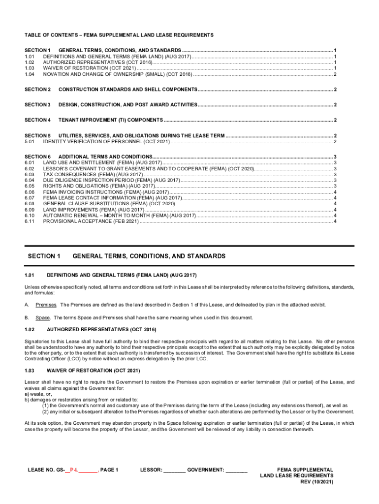 TABLE OF CONTENTS FEMA SUPPLEMENTAL LAND LEASE REQUIREMENTS SECTION 1 GENERAL TERMS, CONDITIONS, AND STANDARDS ...........................................................................................................
