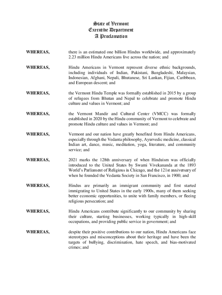 State of Vermont Executive Department A Proclamation WHEREAS, there is an estimated one billion Hindus worldwide, and approximately 2.23 million Hindu Americans live across the nation; whereas, Hindu