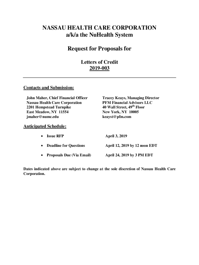 NASSAU HEALTH CARE CORPORATION a/k/a Health System Request for Proposals for Letters of Credit 2019003Contacts and Submission: John Maker, Chief Financial Officer Nassau Health Care Corporation 2201