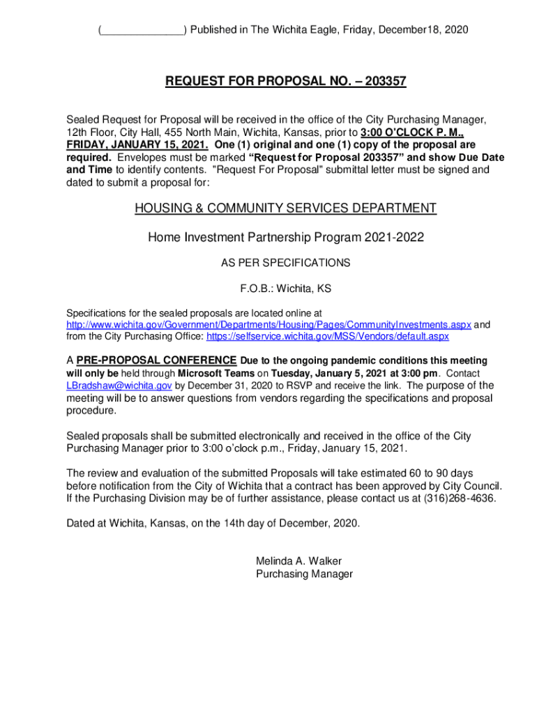 () Published in The Wichita Eagle, Friday, December18, 2020REQUEST FOR PROPOSAL NO. 203357 Sealed Request for Proposal will be received in the office of the City Purchasing Manager, 12th Floor, City