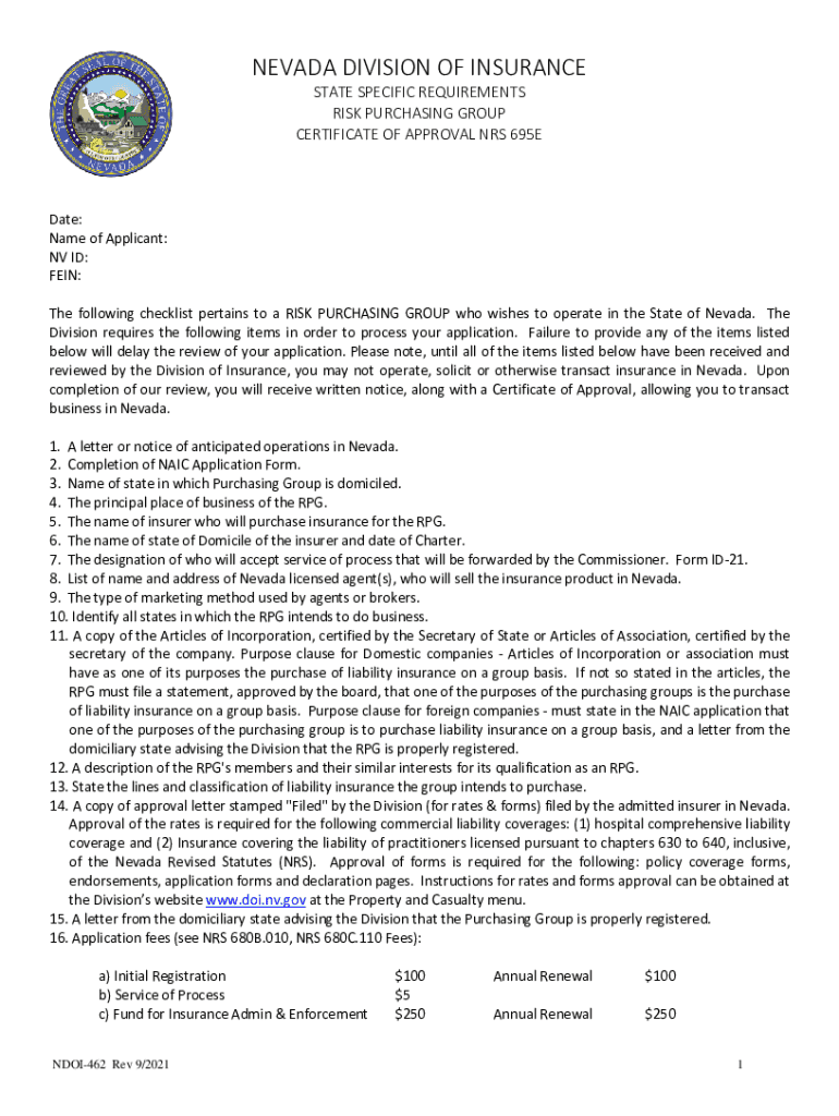 NEVADA DIVISION OF INSURANCE STATE SPECIFIC REQUIREMENTS RISK PURCHASING GROUP CERTIFICATE OF APPROVAL NRS 695EDate: Name of Applicant: NV ID: VEIN: The following checklist pertains to a RISK PURCHASING