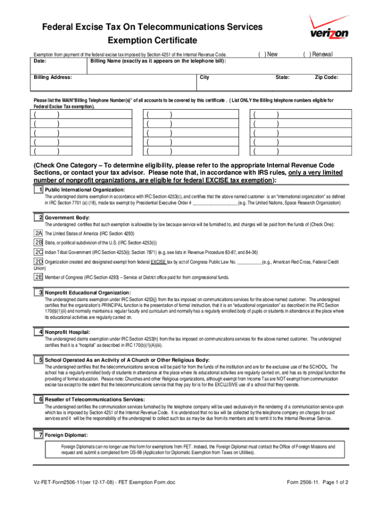 Federal Excise Tax On Telecommunications Services Exemption Certificate () Exemption from payment of the federal excise tax imposed by Section 4251 of the Internal Revenue Code. Date: Billing Name