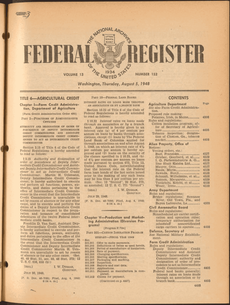0 N A L 4 /s /register '9 3 4VOLUME 13tfC //VIDEO NUMBER 152Washington, Thursday, August 5, 1948TITLE 6 AGRICULTURAL CREDIT Chapters I Farm Credit Administration, Department of Agriculture Farm Credit