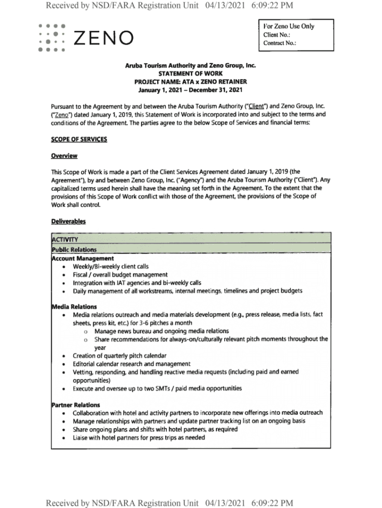 Received by NSW/FAR Registration Unit04/13/20216:09:22 PM For Zeno Use Only NO Client No.: Contract No.:Aruba Tourism Authority and Zeno Group, Inc. STATEMENT OF WORK PROJECT NAME: ATA X ZENO RETAINER