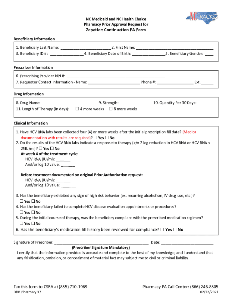 NC Medicaid and NC Health Choice Pharmacy Prior Approval Request forefather: Continuation PA Form Beneficiary Information 1. Beneficiary Last Name: 2. First Name: 3. Beneficiary ID #: 4. Beneficiary