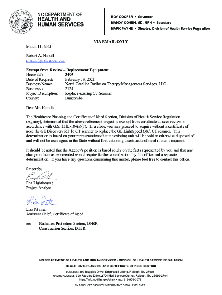 NC DEPARTMENT FROM COOPER GovernorHEALTH AND HUMAN SERVICEMAN COHEN, MD, MPH Secretary MARK PAYNE Director, Division of Health Service Regulation EMAIL ONLY March 11, 2021, Robert A. Hamill rhamill@hallrender.comExempt
