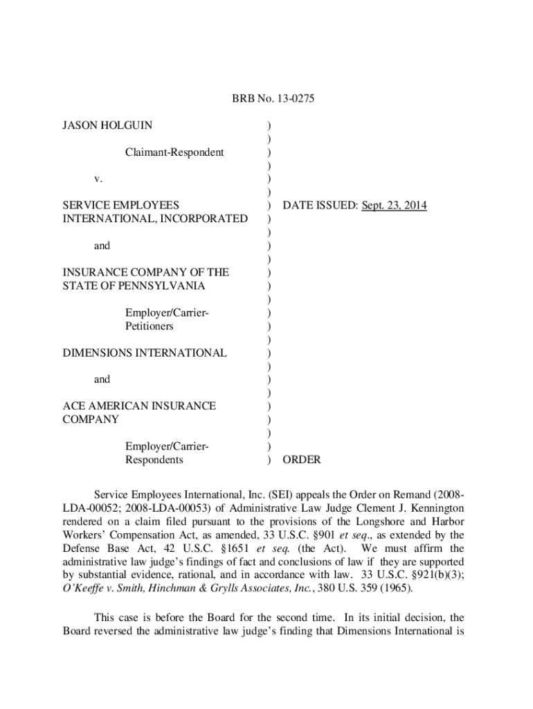 BRB No. 130275 JASON HODGKIN ClaimantRespondent v. SERVICE EMPLOYEES INTERNATIONAL, INCORPORATED and INSURANCE COMPANY OF THE STATE OF PENNSYLVANIA Employer/CarrierPetitioners DIMENSIONS INTERNATIONAL