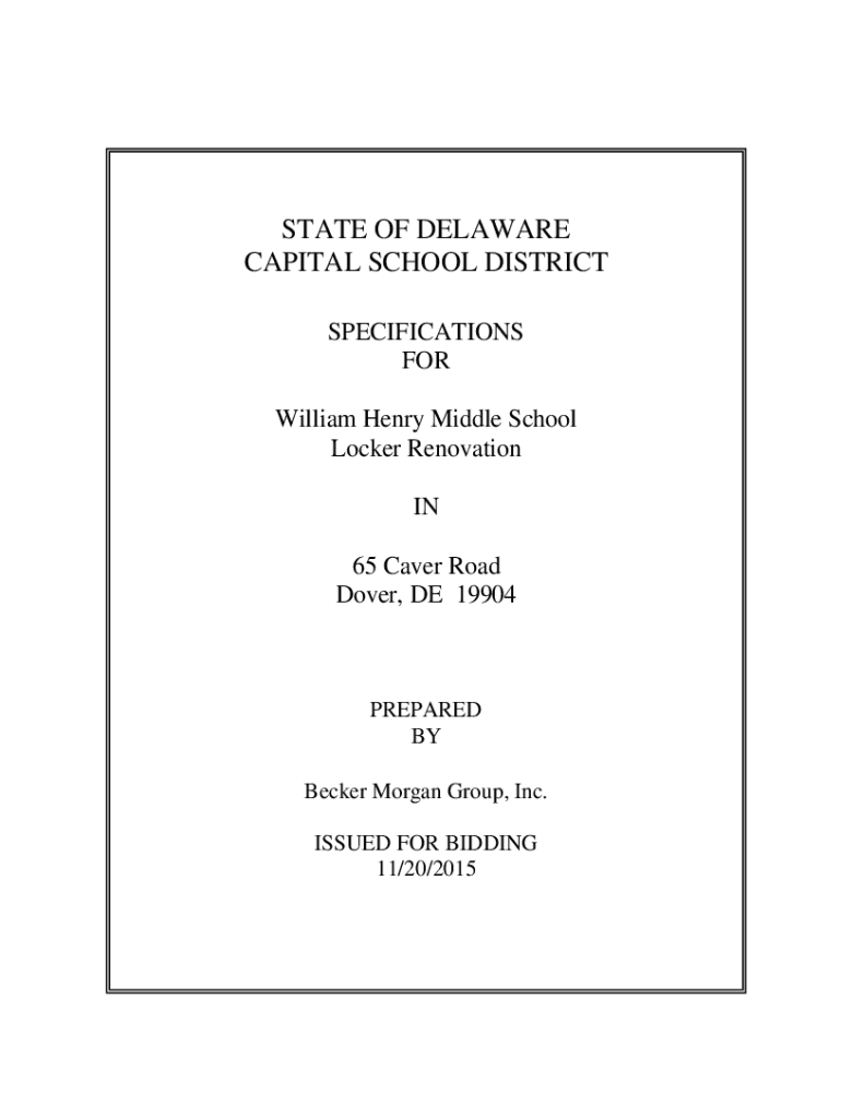 STATE OF DELAWARE CAPITAL SCHOOL DISTRICT SPECIFICATIONS FOR William Henry Middle School Locker Renovation IN 65 Caver Road Dover, DE 19904PREPARED BY Becker Morgan Group, Inc. ISSUED FOR BIDDING