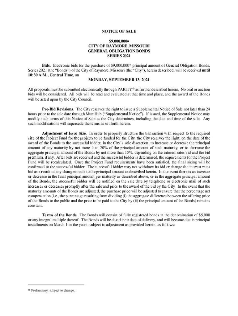 NOTICE OF SALE $9,000,000 CITY OF RAYMOND, MISSOURI GENERAL OBLIGATION BONDS SERIES 2021 Bids. Electronic bids for the purchase of $9,000,000* principal amount of General Obligation Bonds, Series