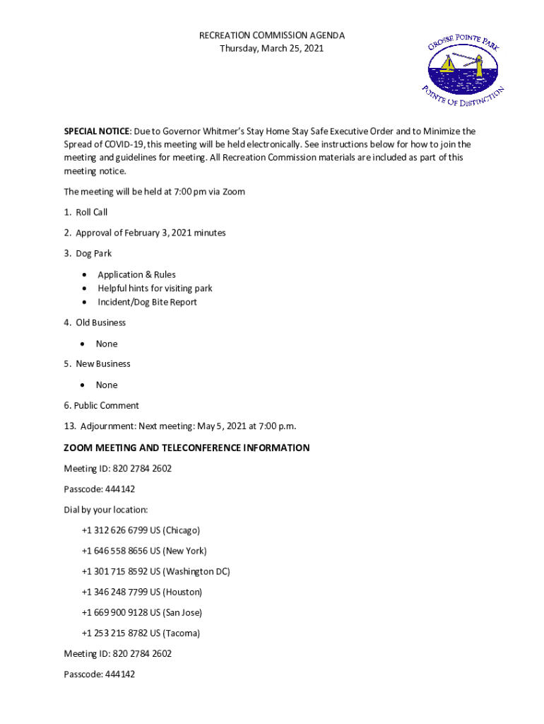 RECREATION COMMISSION AGENDA Thursday, March 25, 2021SPECIAL NOTICE: Due to Governor Whitmer Stay Home Stay Safe Executive Order and to Minimize the Spread of COVID-19, this meeting will be held electronically.