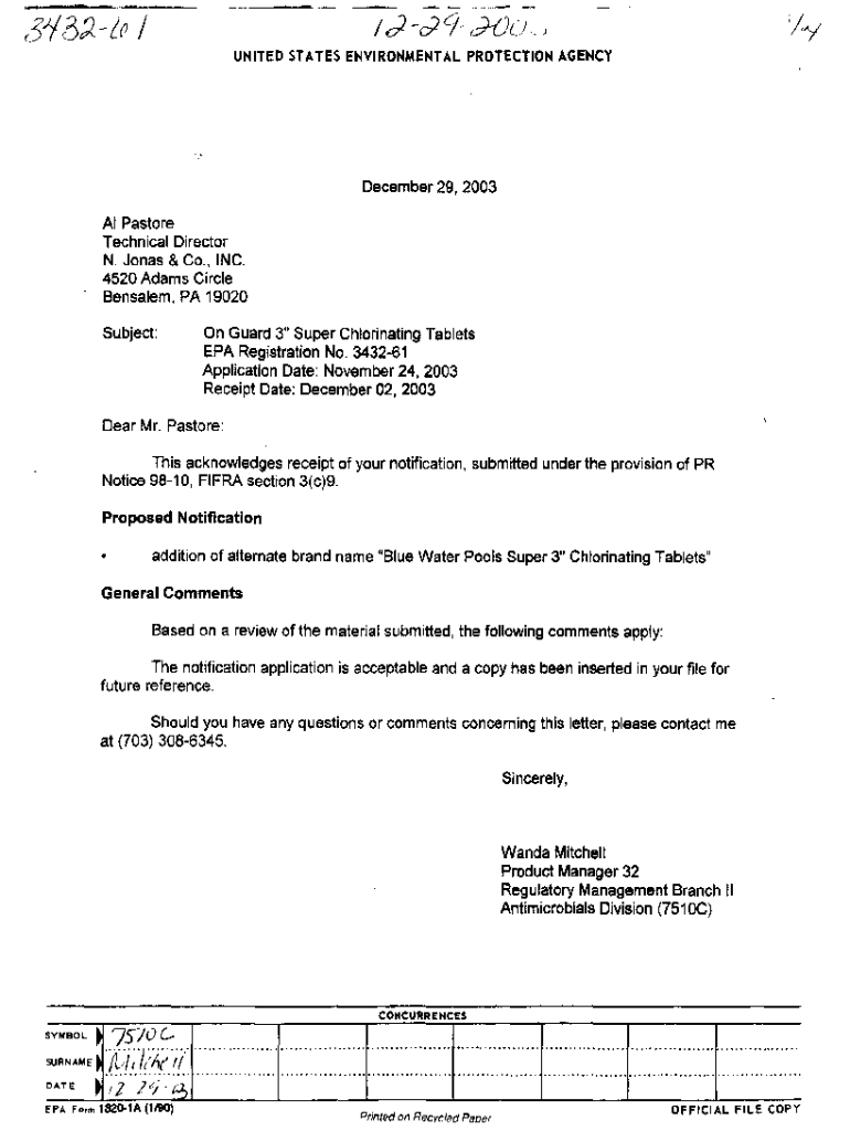 W '/dd1,;OO.UNITED STATES ENVIRONMENTAL PROTECTION AGENCY December 29, 2003, AI Pastor Technical Director N. Jonas & Co., INC. 4520 Adams Circle Bensalem, PA 19020 Subject:On Guard 3 Super Chlorinating