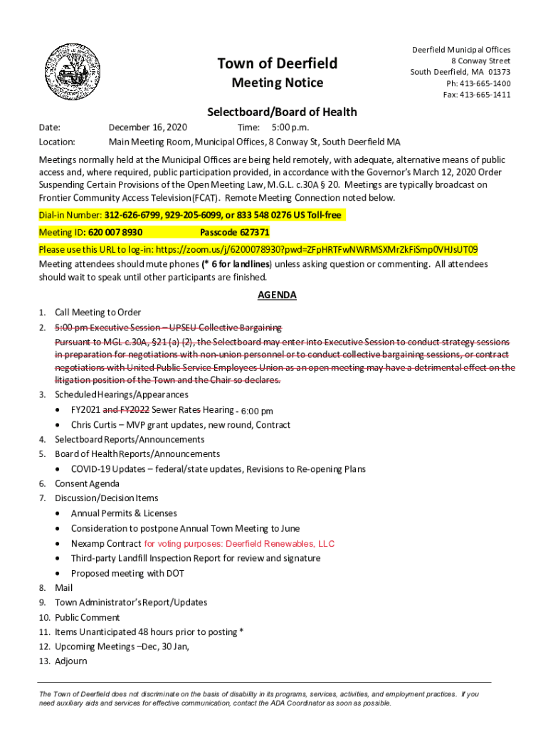 Town of Deerfield Meeting NoticeDeerfield Municipal Offices 8 Conway Street South Deerfield, MA 01373 pH: 4136651400 Fax: 4136651411Selectboard/Board of Health Date: Location:December 16, 2020, Time:
