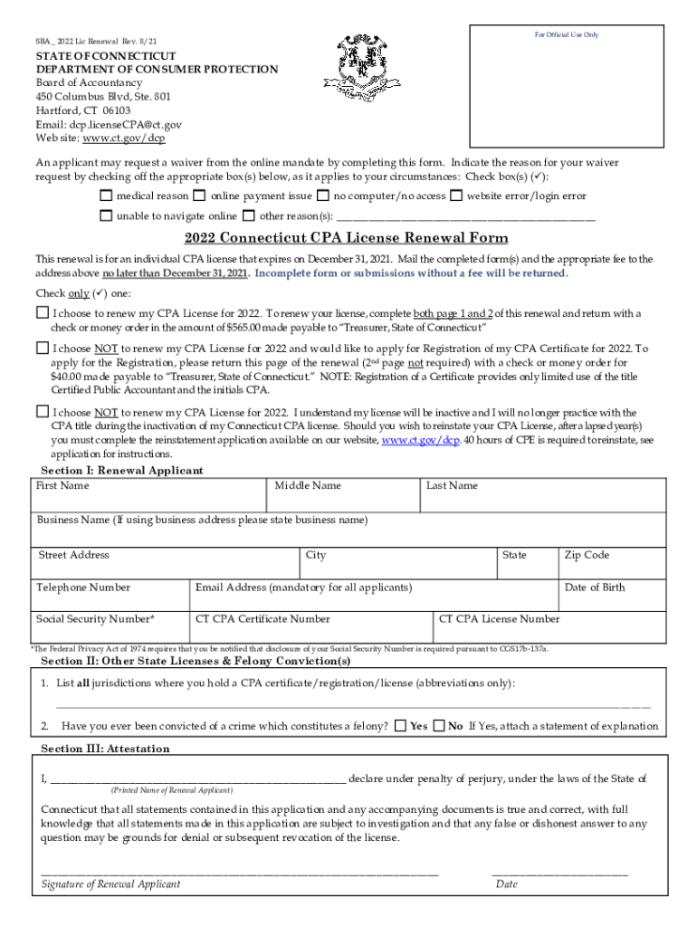 For Official Use Only SBA 2022 LIC Renewal Rev. 8/21STATE OF CONNECTICUT DEPARTMENT OF CONSUMER PROTECTION Board of Accountancy 450 Columbus Blvd, Ste. 801 Hartford, CT 06103 Email: DCP.license CPA