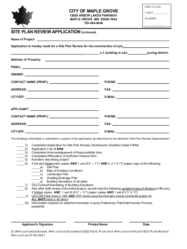 CITY OF MAPLE GROVE 12800 ARBOR LAKES PARKWAY MAPLE GROVE MN 553697064 7634946040Office Use Only: CASE # PLANNER: SITE PLAN REVIEW APPLICATION (in house) Name of Project: Application is hereby made