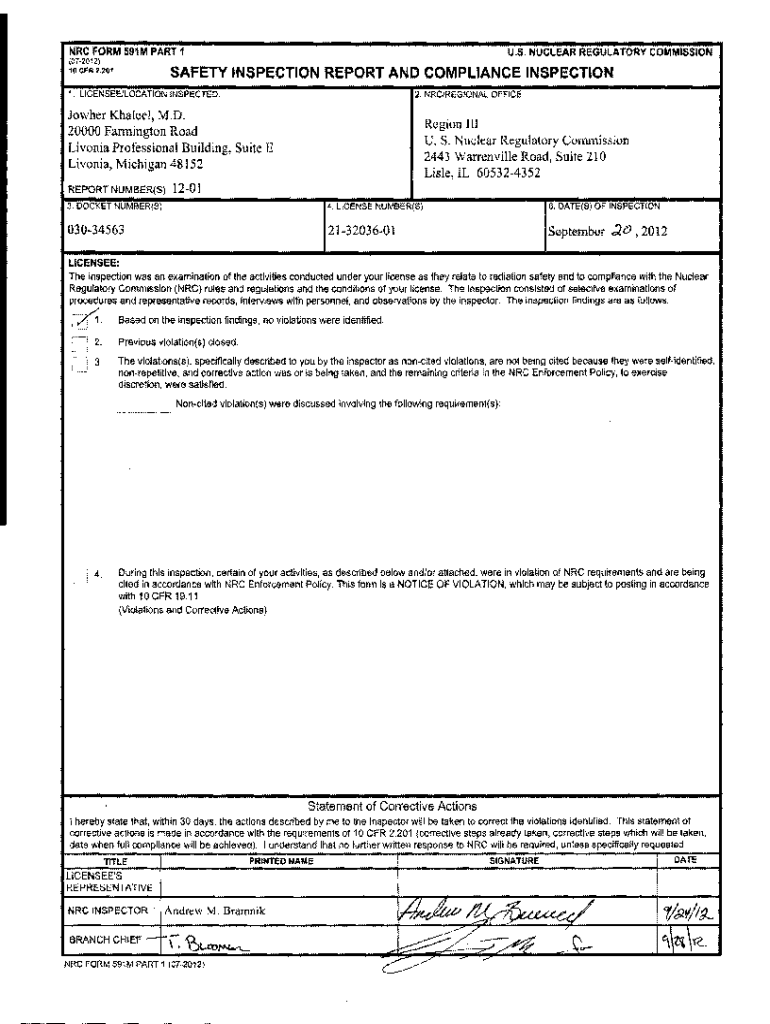 NRC FORM 591M PART 1U. S. NUCLEAR REGULATORY COMMISSION(072012)SAFETY INSPECTION REPORT AND COMPLIANCE INSPECTION1U CFR2.2011. LICENSEE/LOCATION INSPECTED:2. NRC/REGIONAL Officeholder Khaled, M.D.
