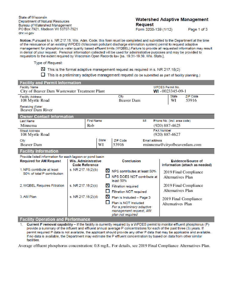 State of Wisconsin Department of Natural Resources Bureau of Watershed Management PO Box 7921, Madison WI 53707792 1 DNR.WI.watershed Adaptive Management Request Form 3200139 (1/1 2)Page 1 of 3Noti