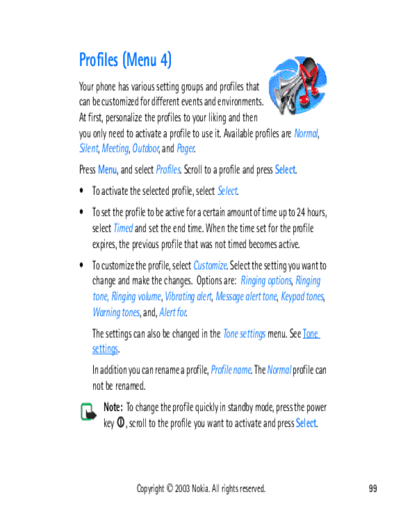 Profiles (Menu 4) Your phone has various setting groups and profiles that can be customized for different events and environments. At first, personalize the profiles to your liking, and then you only