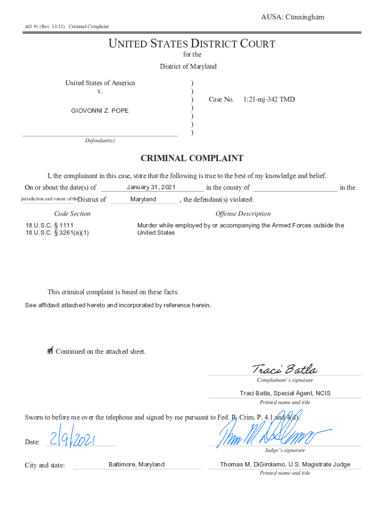 $$86&XQQLQJKDP AO 91 (Rev. 11/11) Criminal ComplaintUNITED STATES DISTRICT COURT for theDistrictDistrict of Maryland of the United States of America v.) ))))))GIOVANNI Z. POPE Case No.1:21mj342 Defendant(s)CRIMINAL