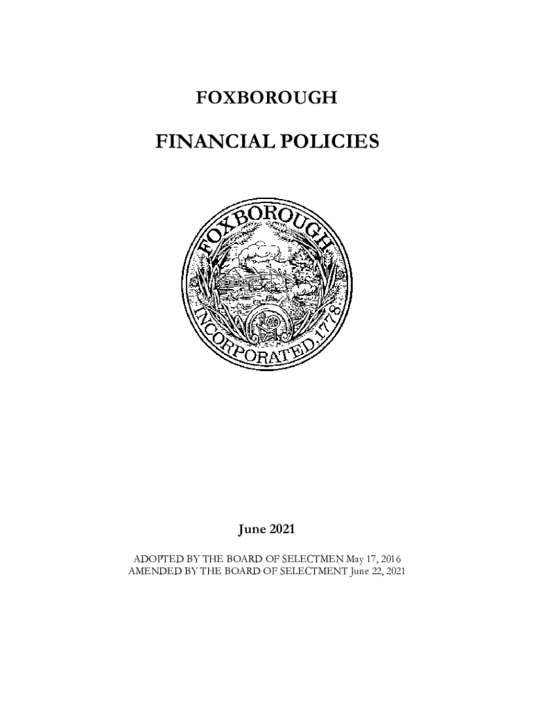FOXBOROUGHFINANCIAL POLICIES June 2021 ADOPTED BY THE BOARD OF SELECTMEN May 17, 2016, AMENDED BY THE BOARD OF SELECTMEN June 22, 2021TABLE OF CONTENTS Section 1: Introduction ...................................................................................................