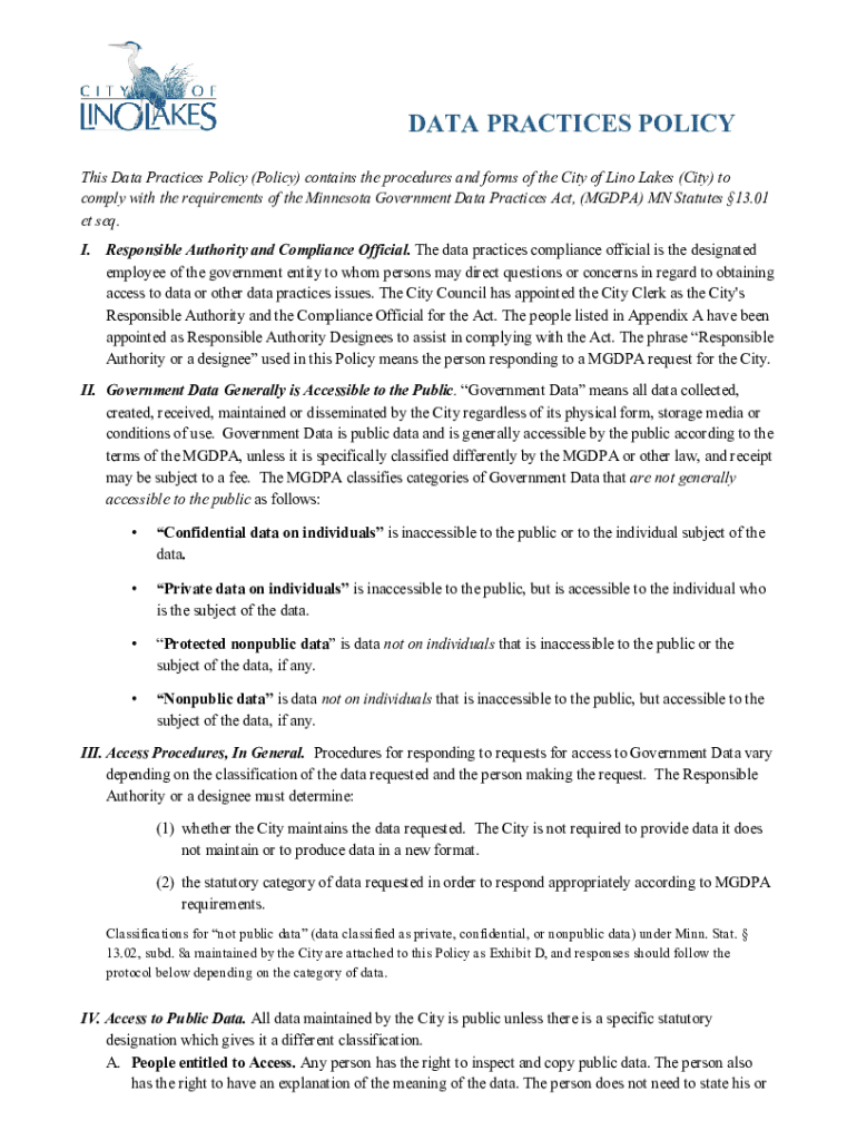 DATA PRACTICES POLICY This Data Practices Policy (Policy) contains the procedures and forms of the City of Lino Lakes (City) to comply with the requirements of the Minnesota Government Data Practices