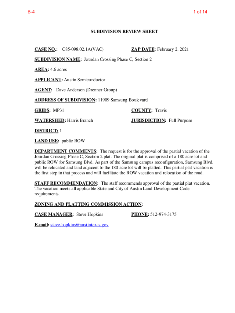 B41 of 14SUBDIVISION REVIEW SHEET CASE NO.: C85098.02.1A(VAC)ZAP DATE: February 2, 2021SUBDIVISION NAME: Jordan Crossing Phase C, Section 2 AREA: 4.6 acres APPLICANT: Austin Semiconductor AGENT: Dave