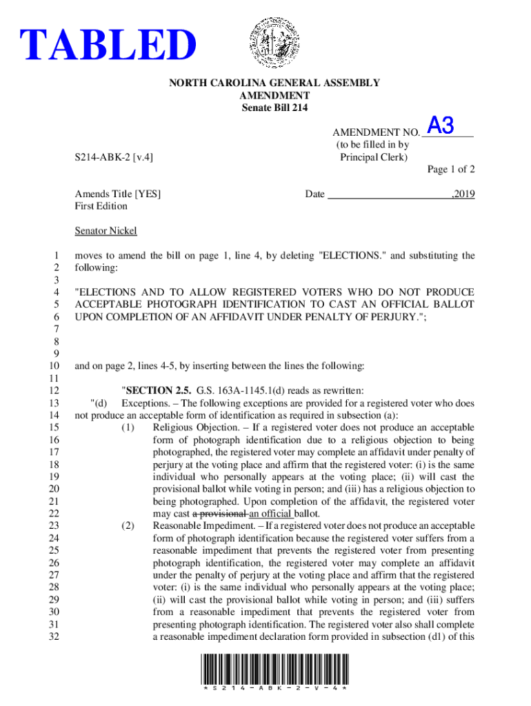 TABLED NORTH CAROLINA GENERAL ASSEMBLY AMENDMENT Senate Bill 214A3 A3AMENDMENT NO. (to be filled in by Principal Clerk) Page 1 of 2S214ABK2 v.4 Amends Title YES First EditionDate,2019Senator Nickel