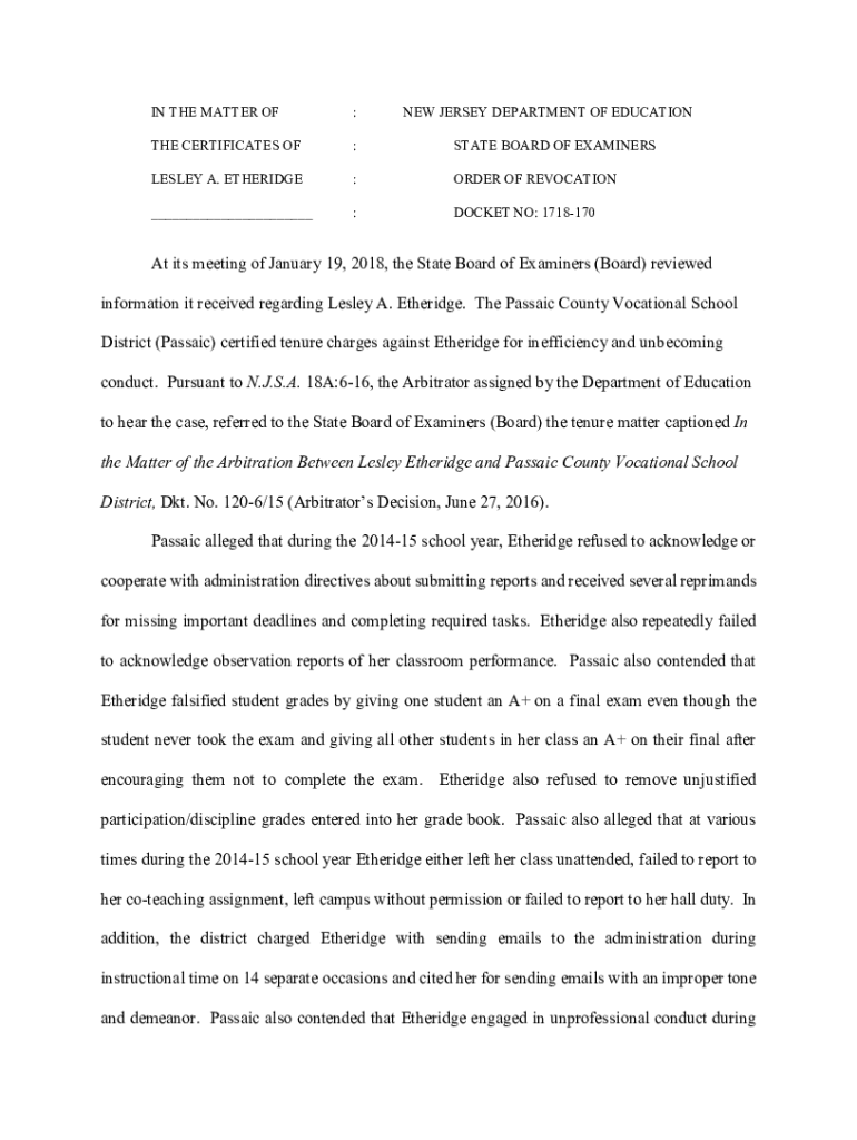 IN THE MATTER OF:NEW JERSEY DEPARTMENT OF EDUCATION CERTIFICATES OF:STATE BOARD OF EXAMINERSLESLEY A. LETHBRIDGE:ORDER OF REVOCATION :DOCKET NO: 1718170At its meeting of January 19, 2018, the State