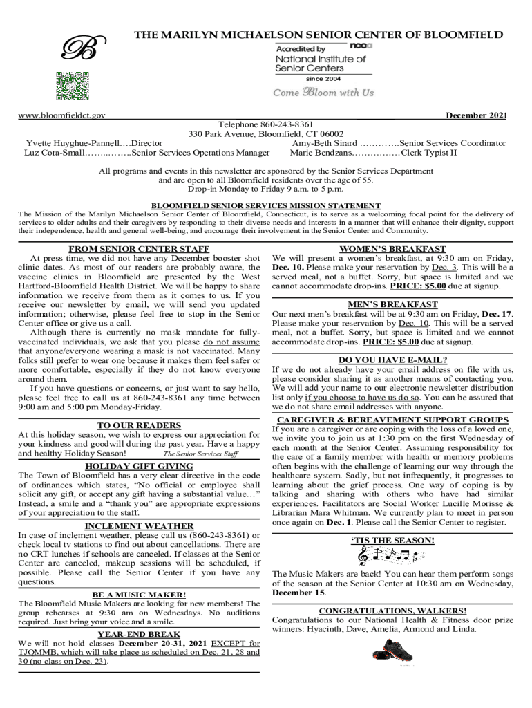 THE MARILYN MICHELSON SENIOR CENTER OF BLOOMFIELDsince 2004www.Bloomfield.gov December 2021 Telephone 8602438361 330 Park Avenue, Bloomfield, CT 06002 Yvette HuyghuePannell. Director Amy Beth Girard.