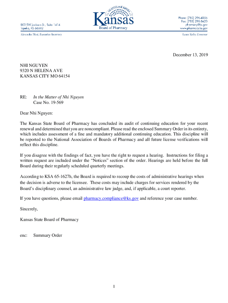 December 13, 2019, NHS NGUYEN 9320 N HELENA AVE KANSAS CITY MO 64154RE:In the Matter of NHS Nguyen Case No. 19569Dear NHS Nguyen: The Kansas State Board of Pharmacy has concluded its audit of continuing