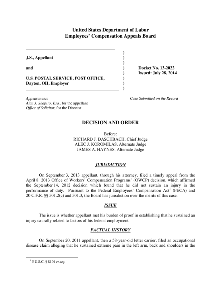 United States Department of Labor Employees Compensation Appeals Board))) and)) U.S. POSTAL SERVICE, POST OFFICE,) Dayton, OH, Employer)) J.S., AppellantAppearances: Alan J. Shapiro, Esq., for the