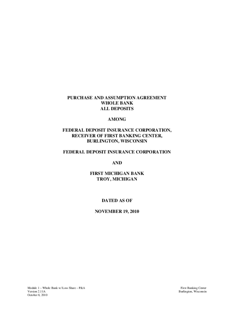 PURCHASE AND ASSUMPTION AGREEMENTWHOLE BANK ALL DEPOSITSAMONGFEDERAL DEPOSIT INSURANCE CORPORATION, RECEIVER OF FIRST BANKING CENTER, BURLINGTON, WISCONSINFEDERAL DEPOSIT INSURANCE CORPORATIONANDFIRST
