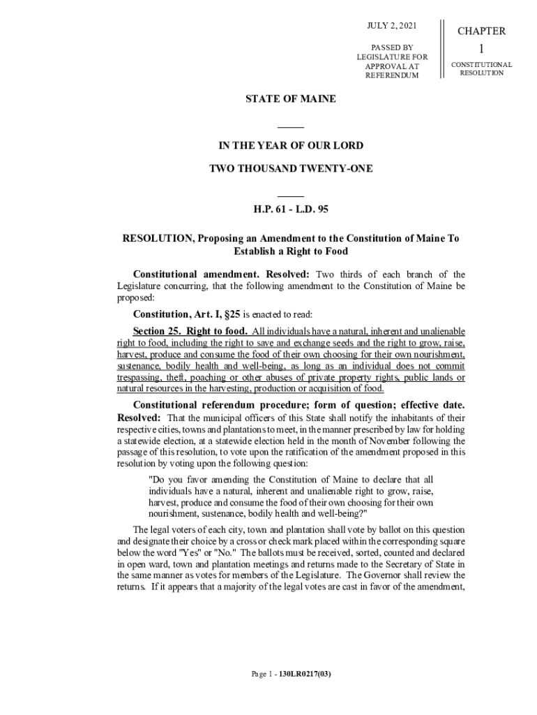 JULY 2, 2021, PASSED BY LEGISLATURE FOR APPROVAL AT REFERENDUMCHAPTER1 CONSTITUTIONAL RESOLUTIONSTATE OF MAINE IN THE YEAR OF OUR LORD TWO THOUSAND TWENTY ONE H.P. 61 L.D. 95 RESOLUTION, Proposing
