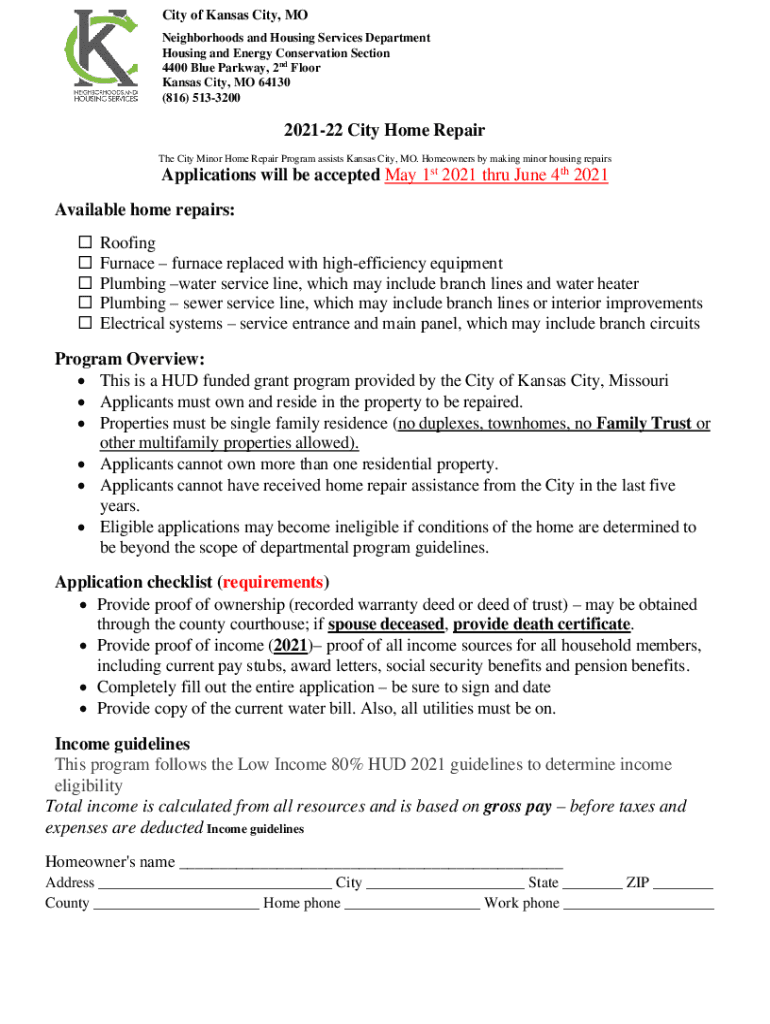 City of Kansas City, MO Neighborhoods and Housing Services Department Housing and Energy Conservation Section 4400 Blue Parkway, 2nd Floor Kansas City, MO 64130 (816) 5133200202122 City Home Repairs