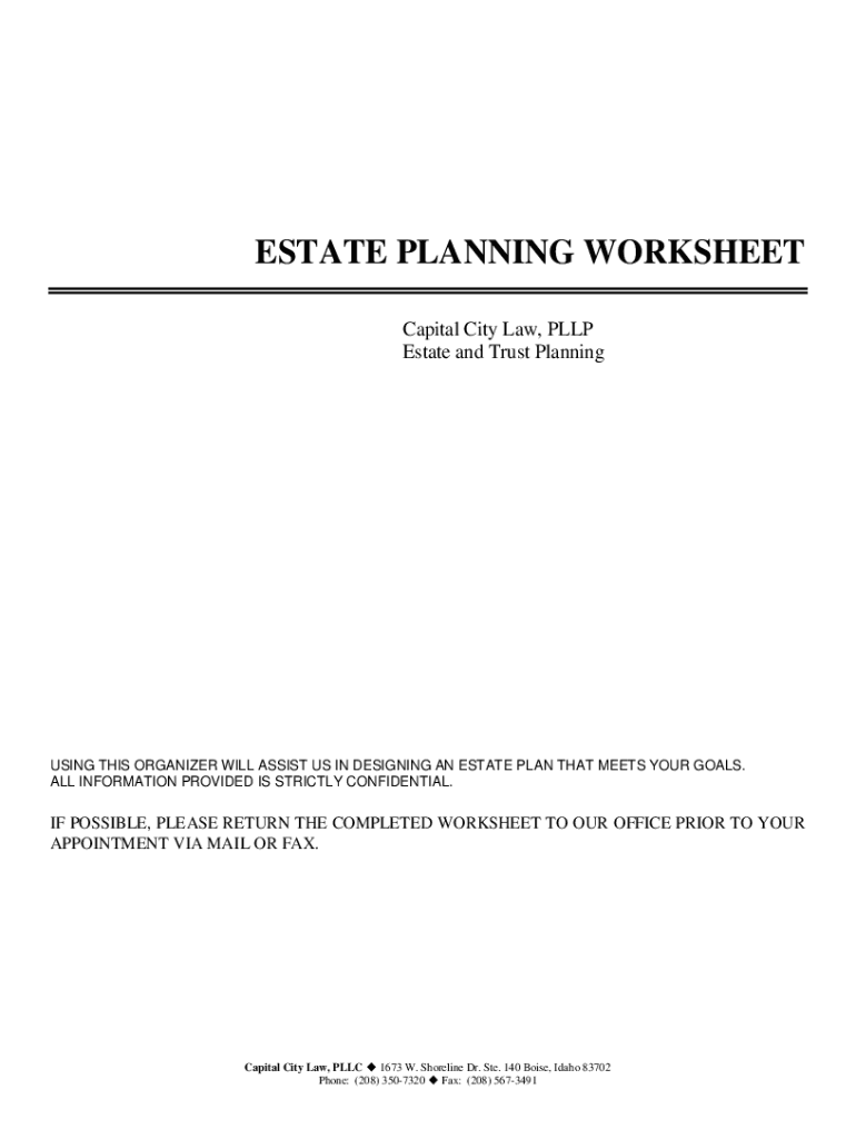 ESTATE PLANNING WORKSHEET Capital City Law, PULP Estate and Trust PlanningUSING THIS ORGANIZER WILL ASSIST US IN DESIGNING AN ESTATE PLAN THAT MEETS YOUR GOALS. ALL INFORMATION PROVIDED IS STRICTLY
